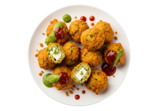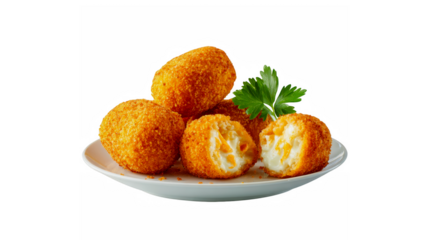 Crispy croquettes with dipping sauce beautifully presented on a white plate on transparent background