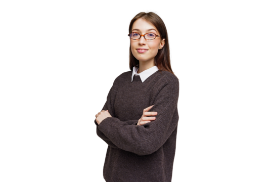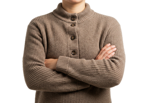 person wearing a brown knitted sweater with buttons stands with arms crossed against a isolated white background