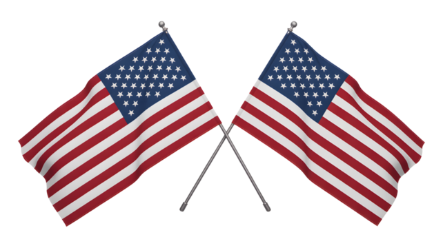 Two american flags crossed elegantly representing unity and patriotism on a solemn black background isolated on transparent background