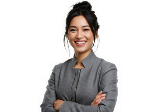 Portrait of a smiling woman with crossed arms wearing a black blazer against a black background on transparent background