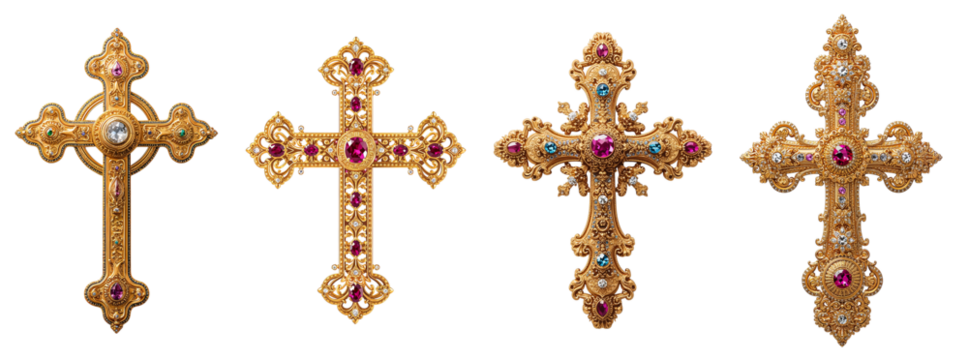 Set of three vintage golden cross isolated on transparent PNG backgrounds.