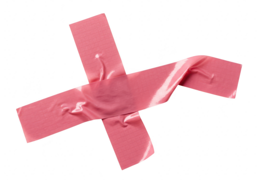 A cross shape made of pink adhesive tape is isolated on a transparent background showcasing its texture and color