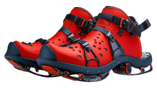 Cross-country ski boot with binding, black and red winter sports footwear for outdoor snow activities, isolated on transparent background