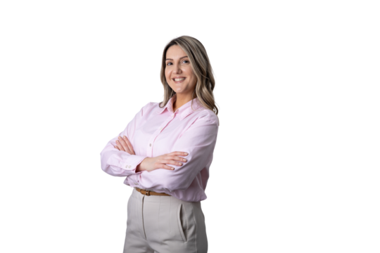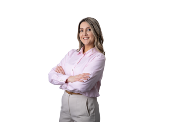 Smiling woman in white shirt with crossed arms isolated on transparent background