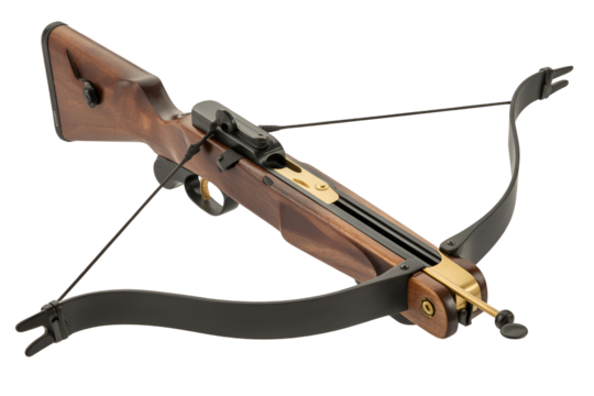 Wooden hunting crossbow with black string isolated on transparent background