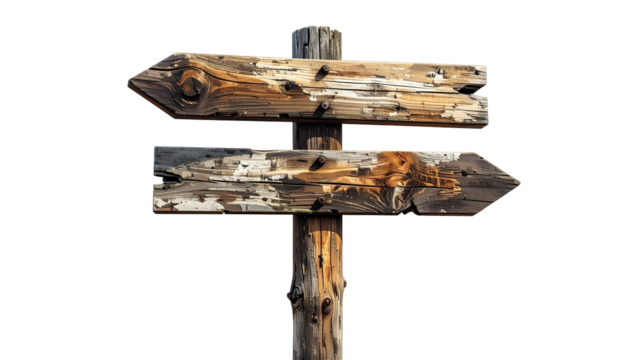 Wooden signpost with blank directional arrows pointing right, offering choice and path decisions on transparent background
