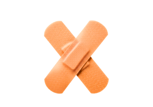 Two light beige adhesive bandages crossed in an X shape over a white background