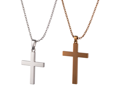 A - Christian Cross Necklace Hanging with Chain, Angled Perspective, Silver and Bronze Pair, Isolated PNG