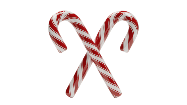 Two red and white striped candy canes crossed isolated on a transparent background Christmas sweet 1