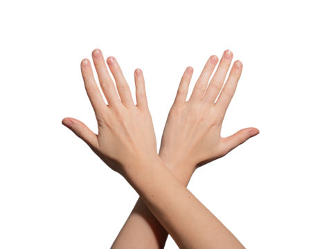 Well-groomed female hands with glossy, polished nails crossing at the wrist. Neat, soft skin with a minimalist, aesthetic look. Beauty, hygiene, and elegance. Isolated on white background..