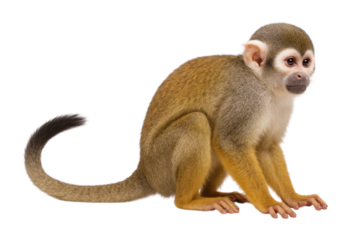 A cute young Common Squirrel Monkey, Saimiri sciureus, sitting in profile with its long tail curled, Isolated on Transparent and White Background