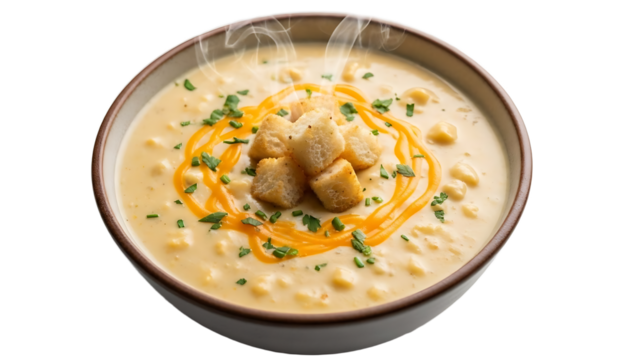 A steaming bowl of creamy soup with croutons and herbs on transparent background