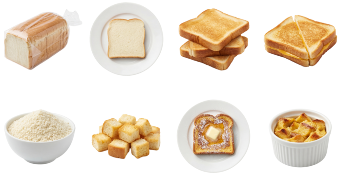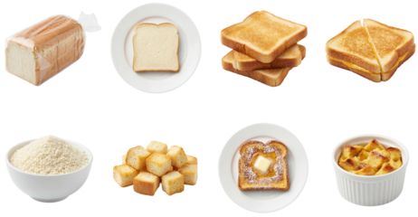 set of white bread in different variations, loaf, slice and toast isolated on a transparent background