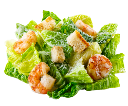 Delicious Caesar salad with grilled shrimp, crispy croutons, and grated parmesan cheese on fresh romaine lettuce leaves tossed in a creamy dressing