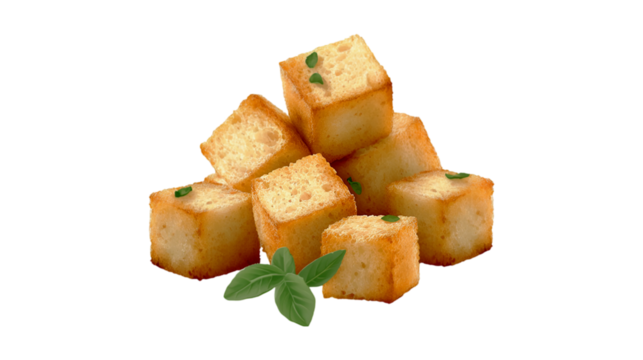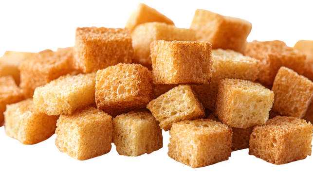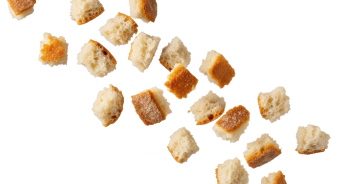 Crunchy croutons falling on transparent background, ready to add flavor and texture