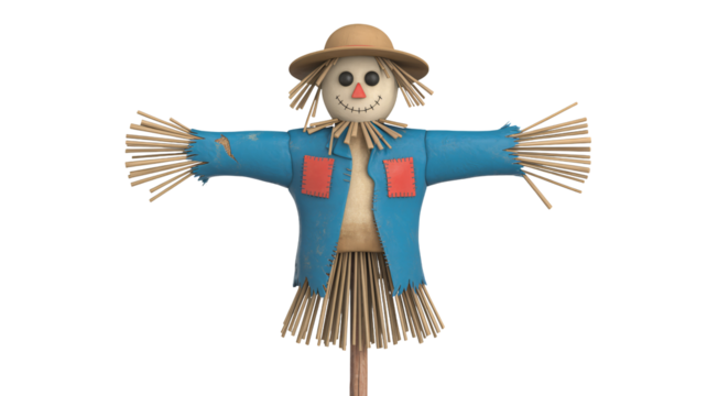 Cheerful scarecrow illustration with arms out and wearing a hat on an isolated white background