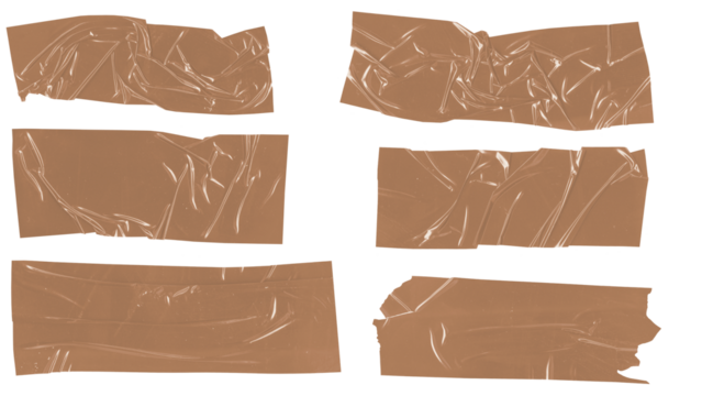 Collection of brown duct tape strips with a textured finish, isolated on a white background, showcasing varied shapes and edges
