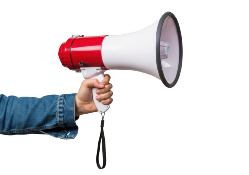 Hand holding a red and white megaphone isolated on transparent background