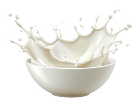 Creamy white liquid splashes upwards from a white bowl, creating a crown