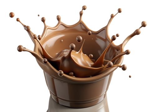 A dynamic and luxurious splash of creamy milk chocolate erupts from a bowl creating an artistic crown shape with droplets and spheres against a stark black background