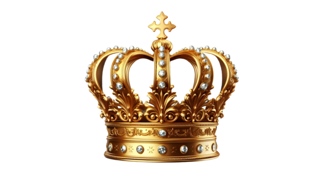 Ornate golden crown with red velvet and precious gems isolated on a transparent background jewels