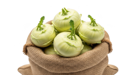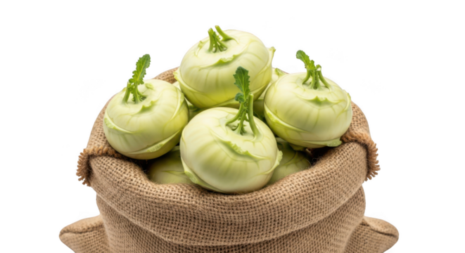 Fresh kohlrabi vegetables in a burlap sack isolated on transparent background