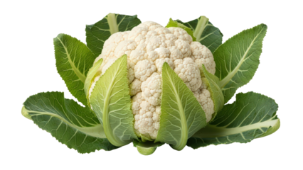 Fresh whole cauliflower with vibrant green leaves, healthy crop isolated on transparent background