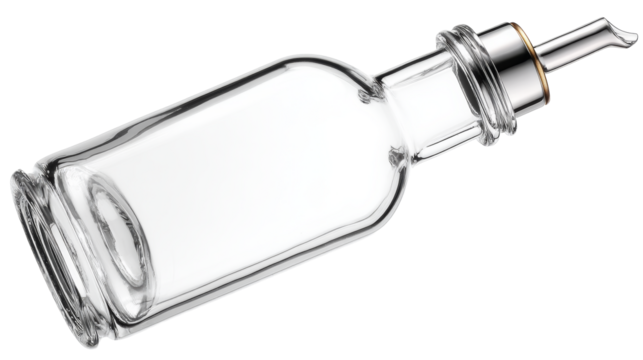 Elegant glass olive oil cruet with spout isolated PNG on transparent background, kitchenware for gourmet cooking and Mediterranean cuisine