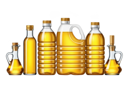 Variety of liquid edible oils in different bottles and cruets for cooking and baking. isolated on transparent background