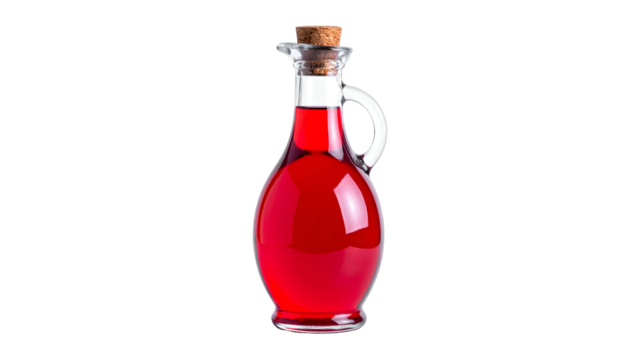 A curvy, clear glass cruet filled with a vibrant red liquid, topped with a cork stopper