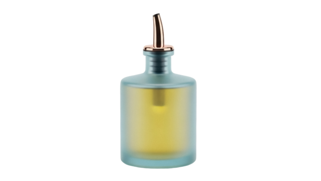 Isolated cruet or oil decanter for kitchen, clear glass container with copper spout, fillable