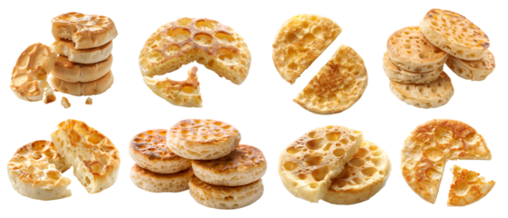 Crumpet Crumpets griddle pancake bread bun on transparent cutout, PNG file. Many assorted different angles, stack, broken, pile, slice. Mockup template for artwork