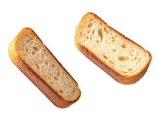 Two slices of fresh bread displaying texture and crust, against a white isolated background.