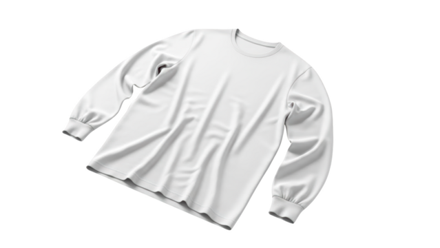 A white long-sleeved shirt lies crumpled on a plain background, showcasing its texture and folds.