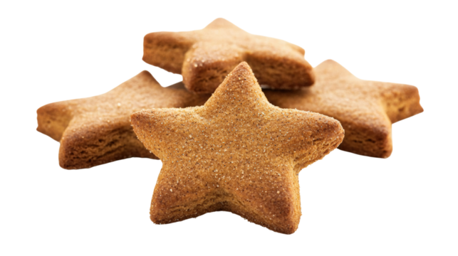 Four star-shaped cookies on a white background. The cookies are brown and have a slightly crunchy texture