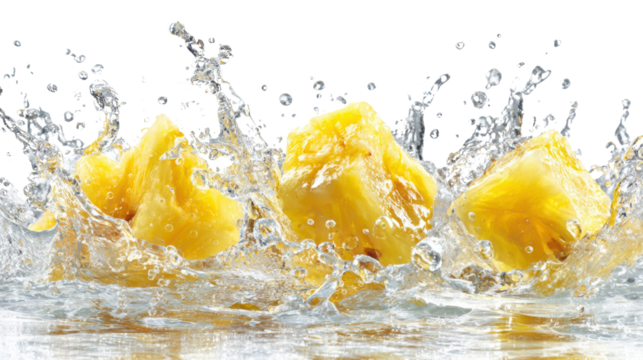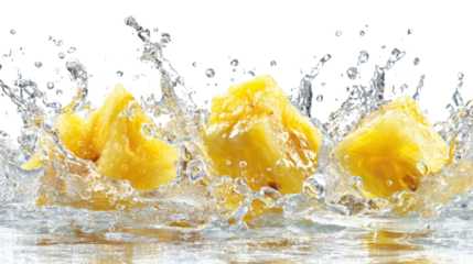 Juicy pineapple chunks splashing in fresh water, perfect for refreshing summer drinks.
