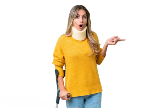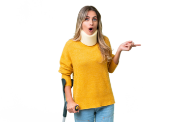 Young Uruguayan woman wearing neck brace and crutches over isolated background surprised and pointing side