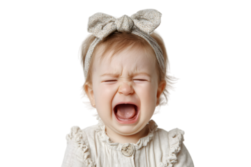 A distressed infant lies on a white surface crying loudly with an open mouth and tear streaked cheeks transparent background