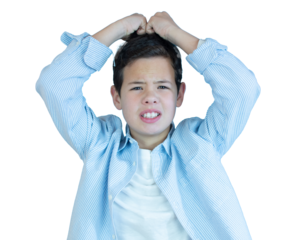 Portrait of a schoolboy crying, isolated on transparent and white background, cut out png