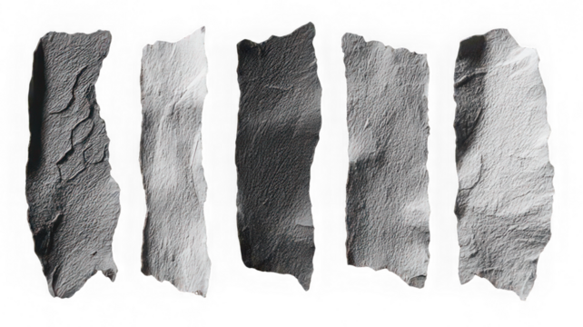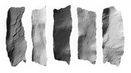 Five rectangular torn paper strips isolated on transparent background, rough edges, white textured surface, perfect for creative design, scrapbooking, or collage projects