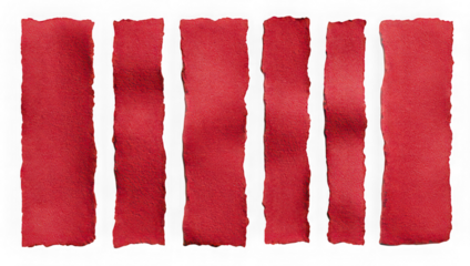 Red watercolor paper strips with torn edges arranged vertically on transparency background, textured surface, artistic and creative mood, suitable for craft or design projects