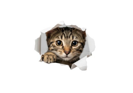 Young cute brown tabby cat kitten with curious brown eyes and extended paw peering through a ragged torn hole in transparent paper, minimalistic background. Concept of feline curiosity and