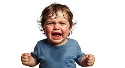 Close up of a crying toddler boy with messy hair isolated on transparent background
