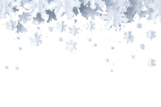 intricate, ultra-detailed crystalline cerulean blue and ivory snowflakes forming an elegant symmetrical top border on a transparent infinity background, high-end festive winter design background