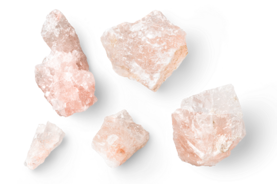 set of pieces of blush pink salt or quartz crystals over a transparent background, isolated cooking, healing, energy or alternative medicine design elements, top view, flat lay
