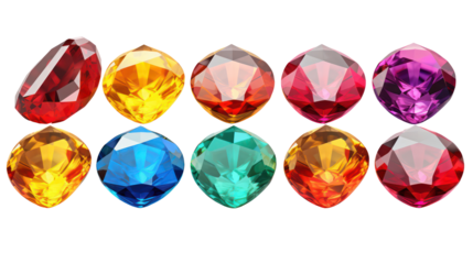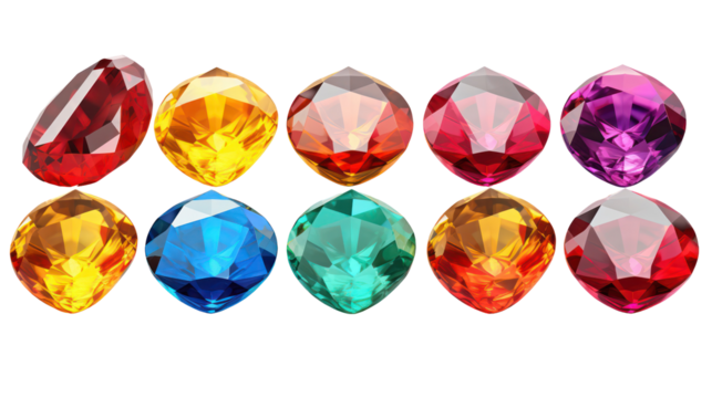 Set of 9 different color high-resolution 3D rendering heart-shaped gemstones on transparent background