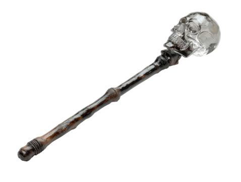 Gothic magic staff with a transparent crystal skull pommel on a dark gnarled wooden shaft.