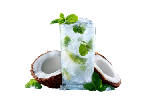 Refreshing coconut mojito with fresh mint leaves and ice cubes on transparent background