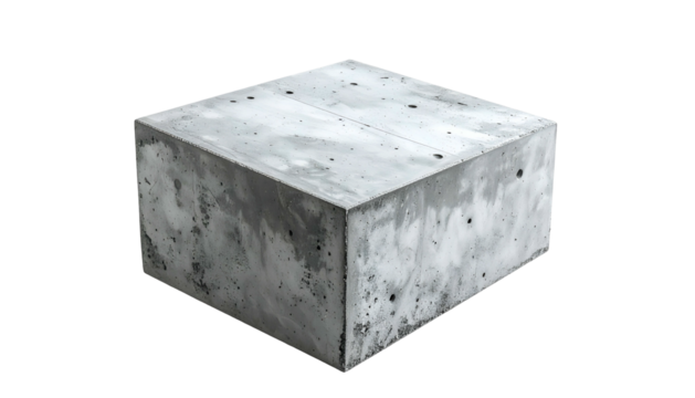 A single, weathered concrete cube sits isolated against a black backdrop, well-lit