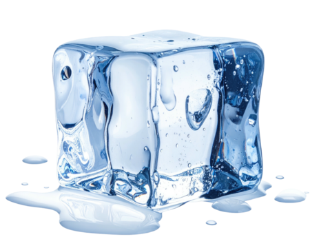 A single, translucent ice cube with air bubbles, isolated against a black background